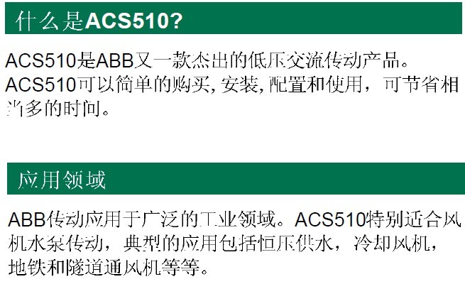 ABB低壓交流傳動 ACS510,1.1KW~110KW ACS510特別適合風機水泵傳動,典型的應用包括恒壓供水,冷卻風機,地鐵和隧道通風機等等。